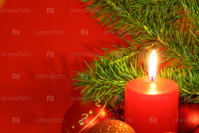 Ветка ели с шарами и горящей свечкой на красном фоне