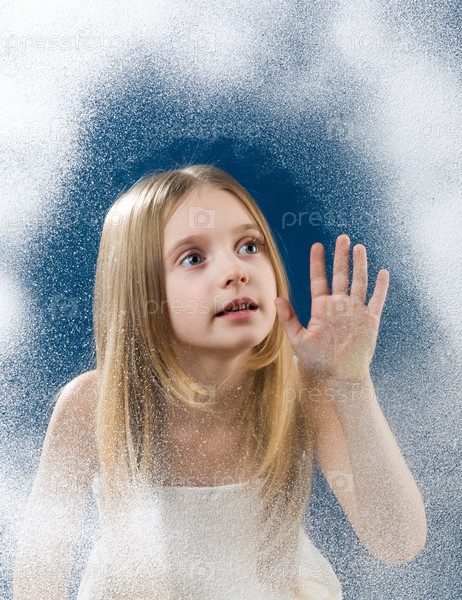 Удивленная маленькая девочка смотрит вверх через морозное окно, прикасаясь к нему рукой
