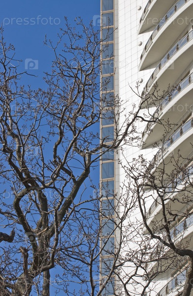 Дерево с опухшими почками на фоне голубого неба и высотного здания.Сочи.Россия