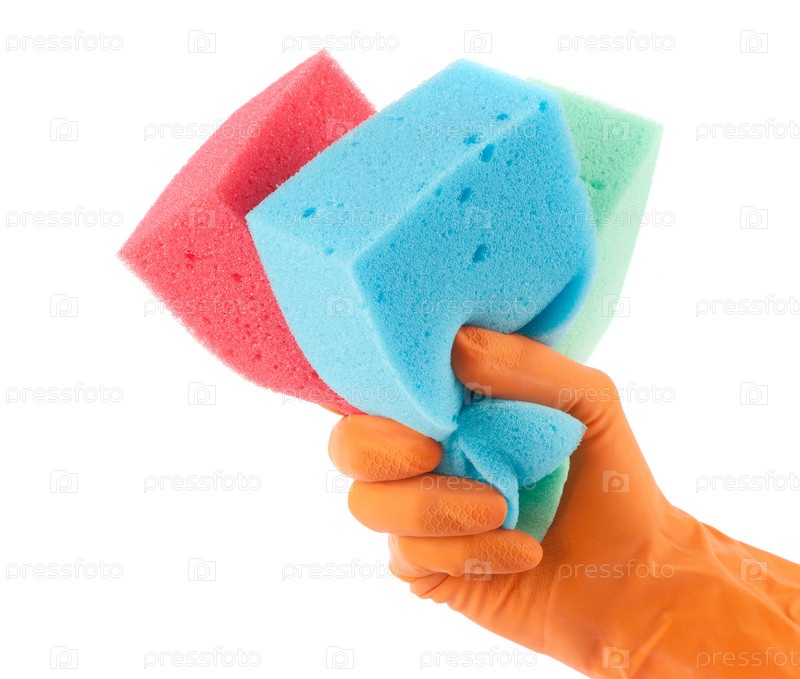 Рука в оранжевой перчатке с губками на белом фоне