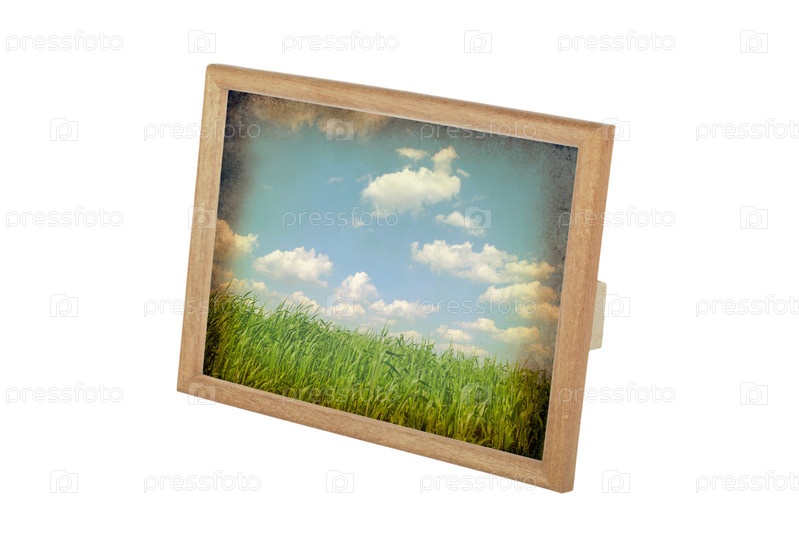 Старая фотография летнего поля в рамке на белом фоне