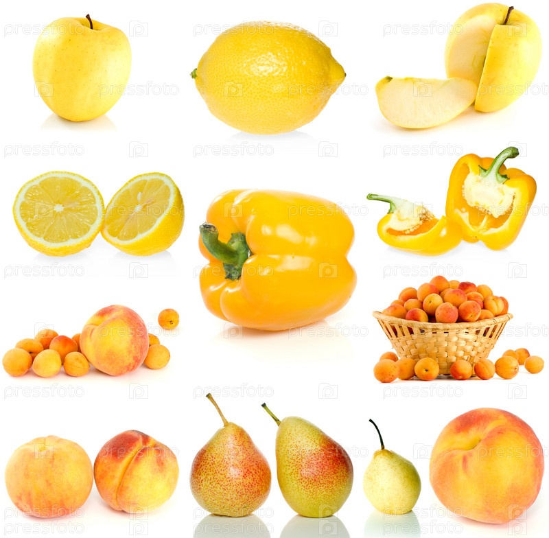 Набор желтых фруктов, ягод и овощей, на белом фоне