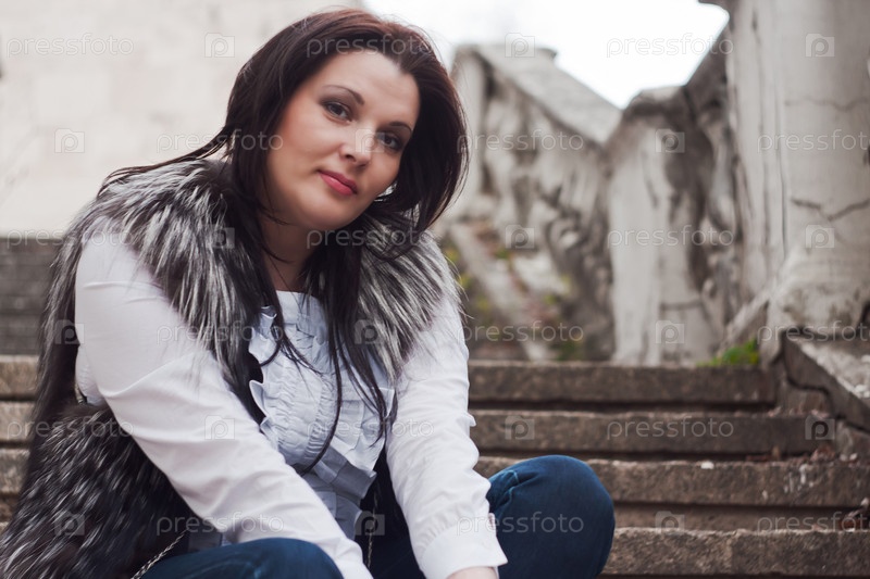 Женщина в меховом жилете на развалинах бетонной лестницы