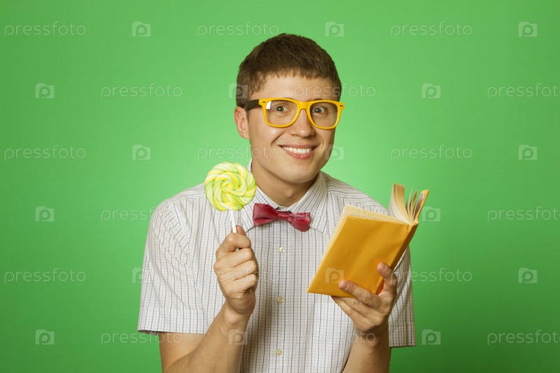 Улыбающийся парень с леденцом и книгой на зеленом фоне