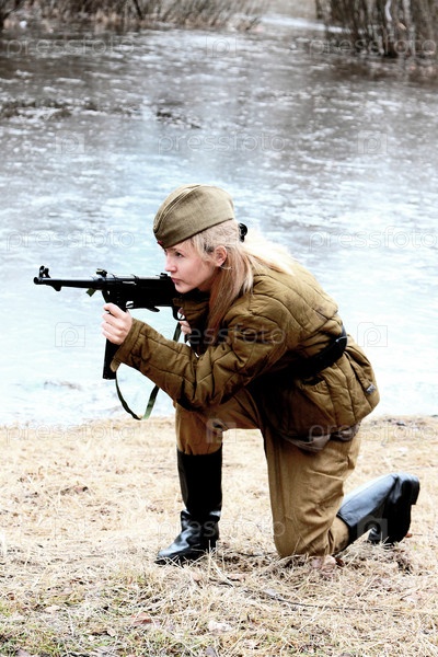 Девушка в военной форме времен ВОВ стреляет из автомата