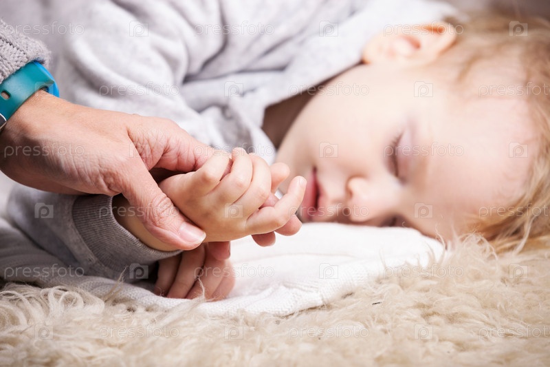 Мать держит спящего сына за руку