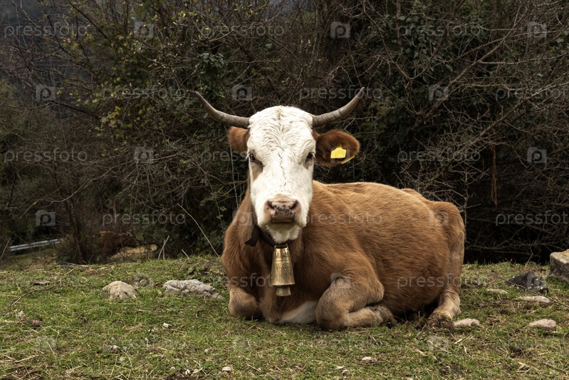 Теленок отдыхает на лугу в горах