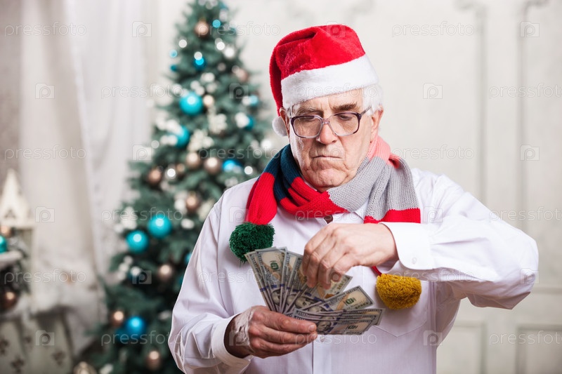 Мужчина в шапке Санта-Клауса держит деньги на фоне Рождественской елки
