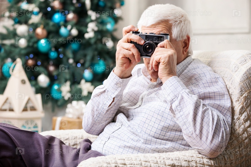 Пожилой мужчина с фотоаппаратом на фоне елки