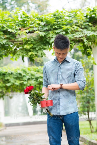 Мужчина с буктом цветов ждет подругу