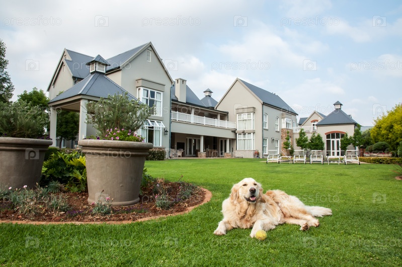 Золотистый ретривер на лужайке у дома