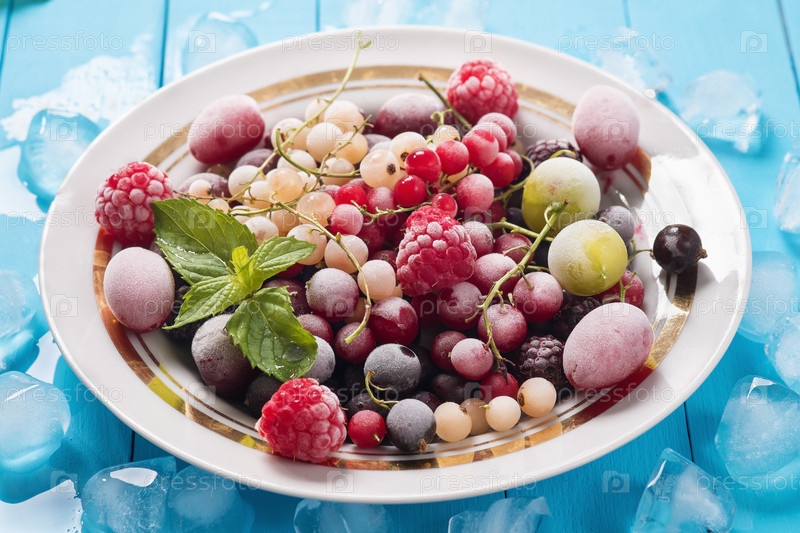 Замороженные ягоды на синем фоне (смородина, малина, голубика, кизил, крыжовник, вишня)