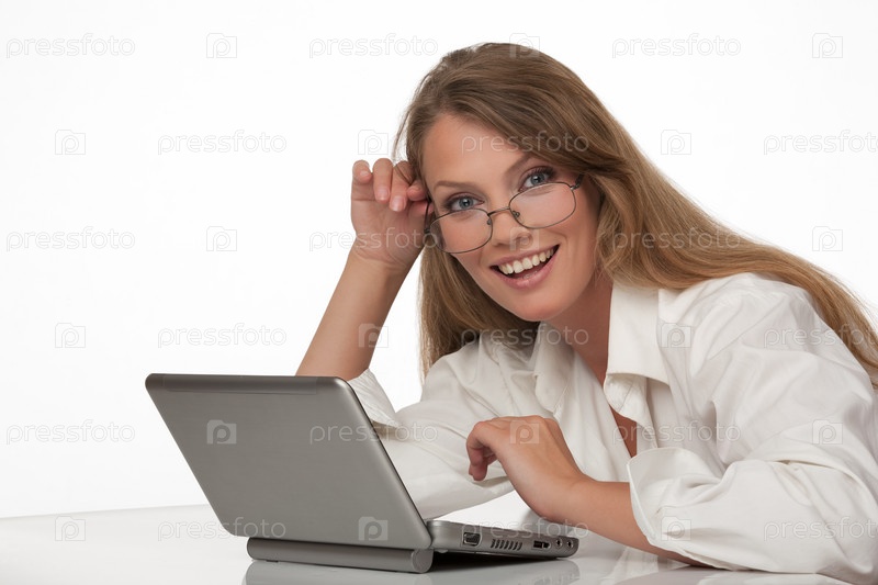 Портрет счастливой женщины в очках перед ноутбуком