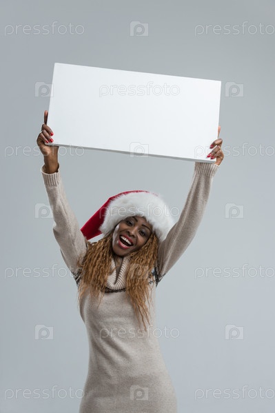 Молодая женщина в шапке Санта-Клауса с табличкой
