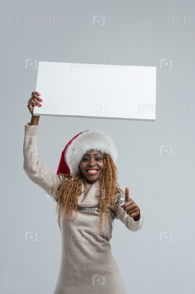 Молодая женщина в шапке Санта-Клауса с табличкой