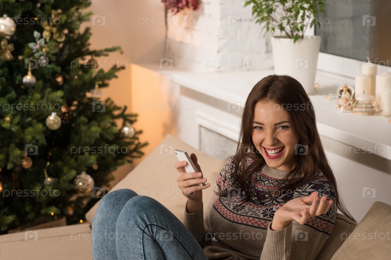 Счастливая женщина читает сообщение в телефоне