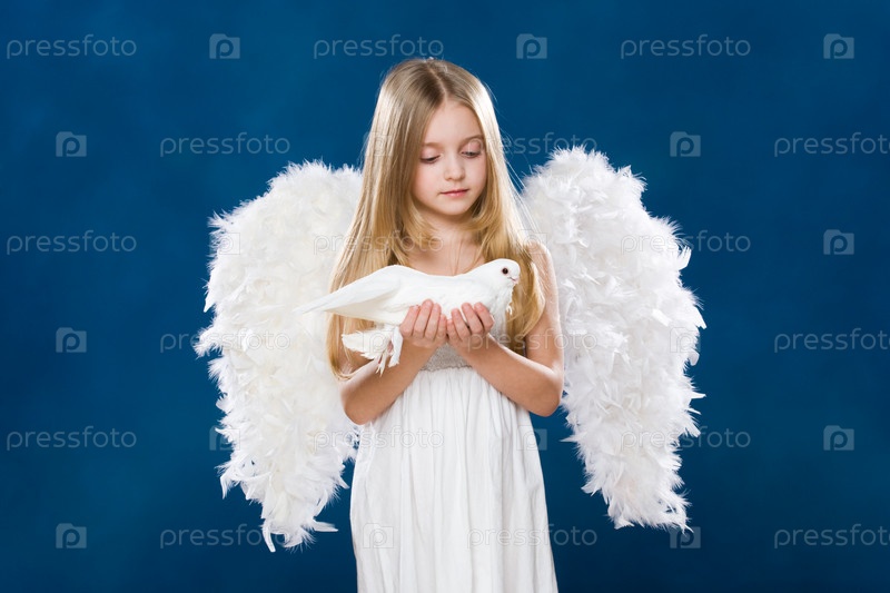 Портрет ангела света с чисто белым голубиком, который смотрит на него с любовью