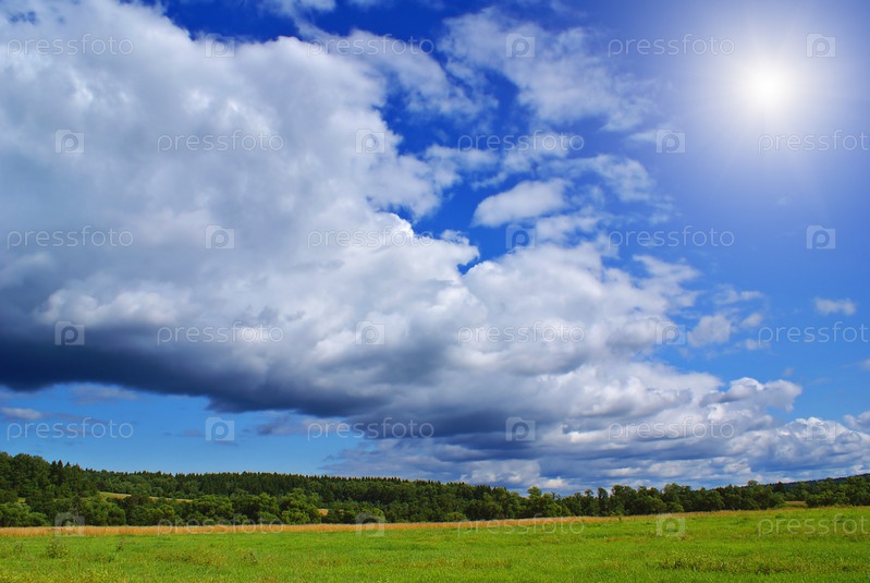 Летний пейзаж с облачным небом, зеленой травой и деревьями