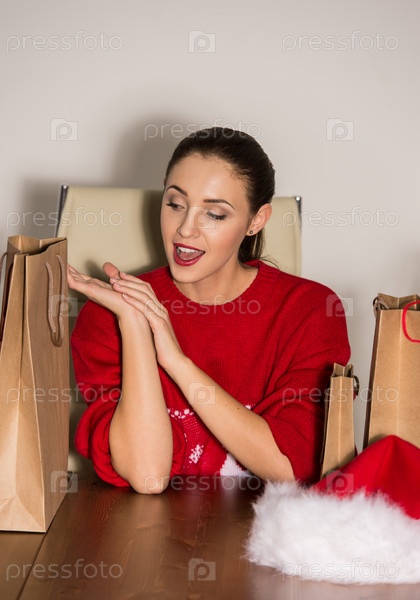 Женщина с пакетами сидит в офисе