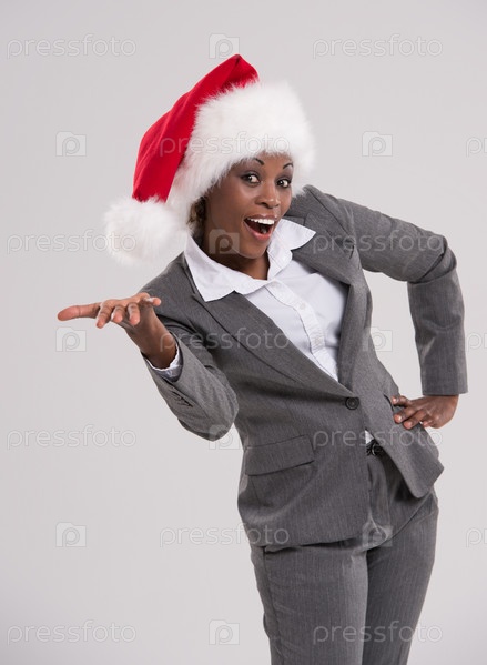 Женщина в колпаке Санты что-то представляет на сером фоне