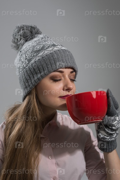 Женщина в зимней одежде держит кружку