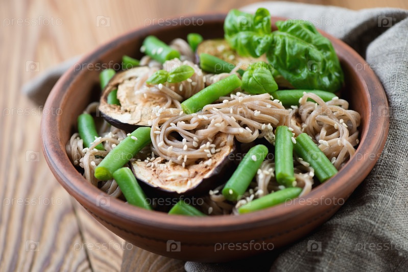 Гречневая лапша с баклажаном, фасолью и кунжутом