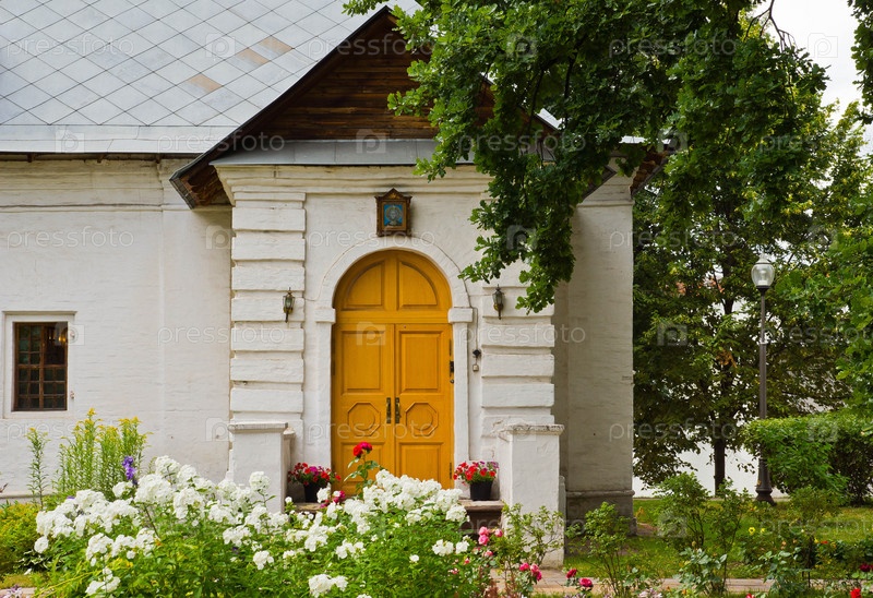 Дом из белого камня и цветник
