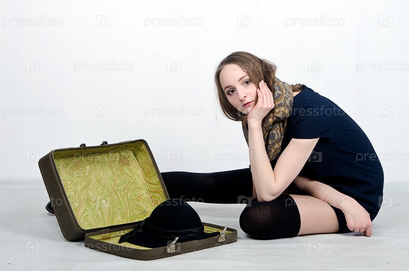 Девушка с чемоданом на белом фоне
