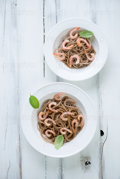 Лапша соба с креветками, вид сверху