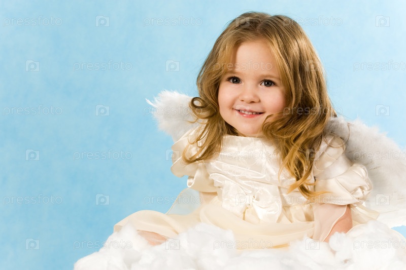 Счастливая девочка в ангельском платье, сидящая на белом облаке и улыбающаяся