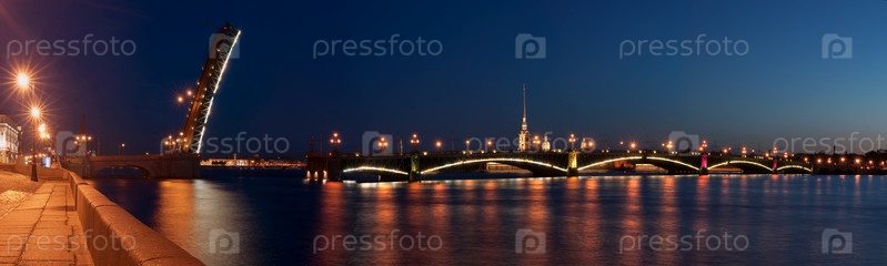 Панорама разведенного Троицкого моста в городе Санкт-Петербург ночью