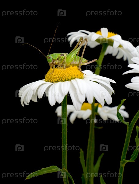 Зеленый кузнечик на ромашке на черном фоне