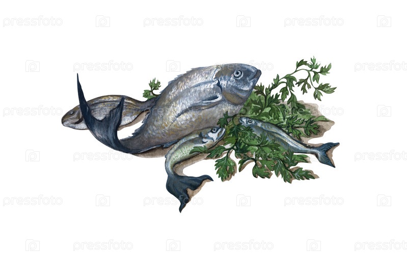Рыба с веточками зелени, иллюстрация на белом фоне