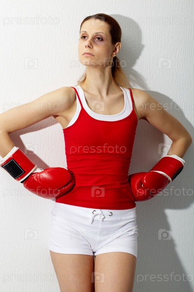 Женщина в боксерской форме с синяком под глазом