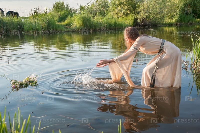Привлекательная девушка опускает венок в воду