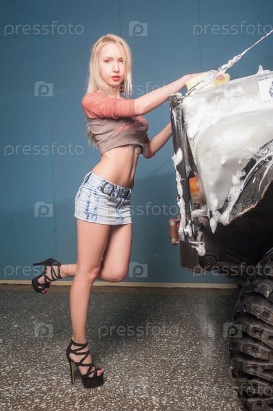 Красивая женщина моет машину