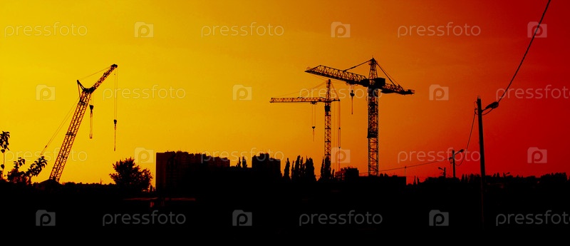 Строительная площадка в сумерках.Силуэты на закате