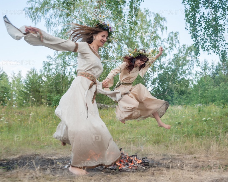 Привлекательные девушки прыгают через огонь