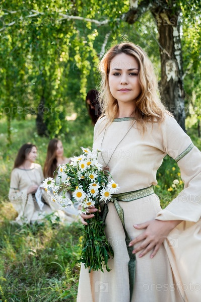 Красивая женщина с букетом ромашек