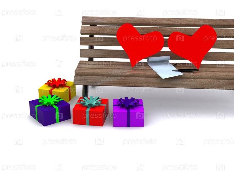 Сердца и письмо на скамейке. 3D