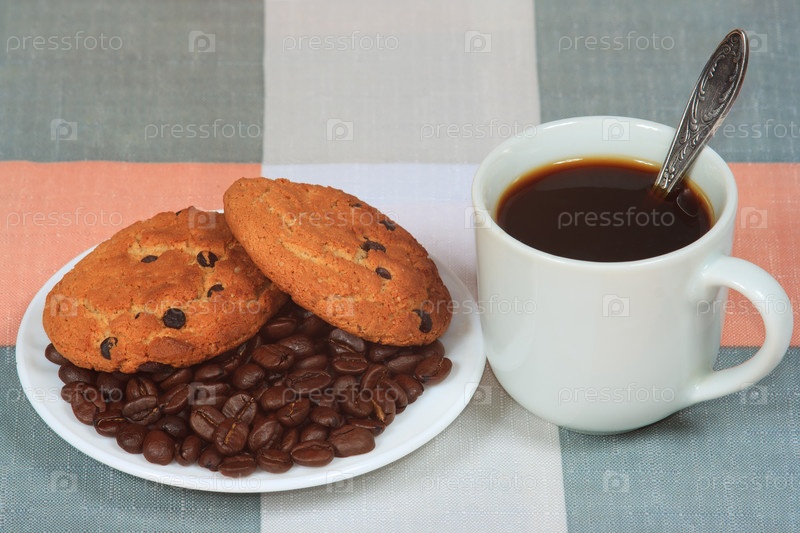 Черный кофе, печенье и кофейные зерна на клетчатой скатерти