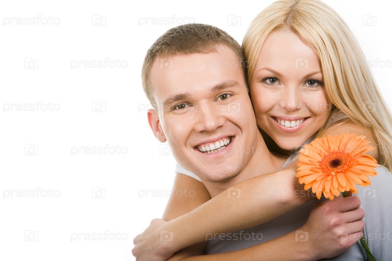 Портрет привлекательной молодой девушки с Герберой, обнимающей своего парня, в то время как оба смотрят на камеру с улыбкой