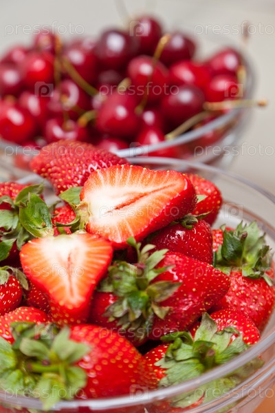 Красная клубника и вишни на столе