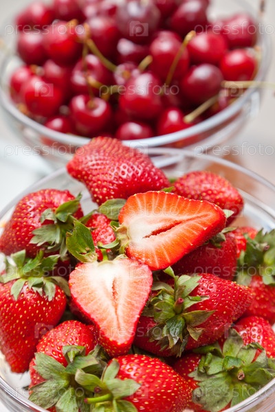 Красная клубника и вишни на столе