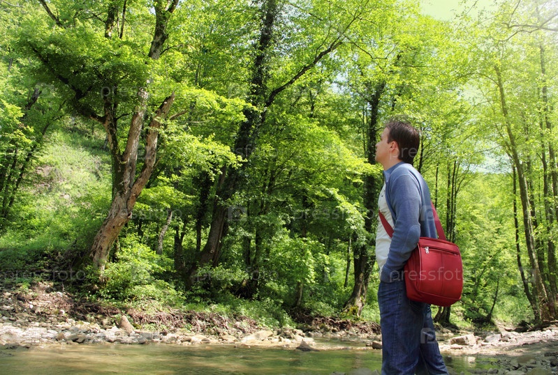 Молодой человек стоит в зеленом лесу у реки