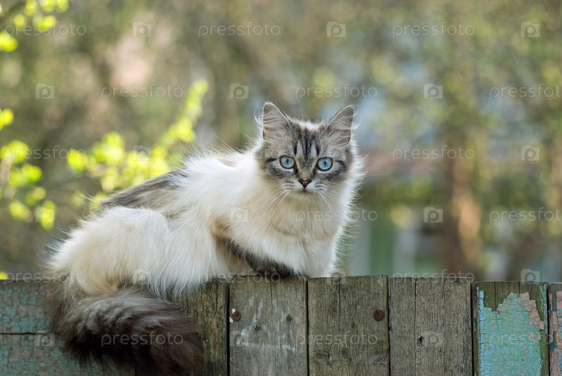 Пушистый голубоглазый кот сидит на заборе
