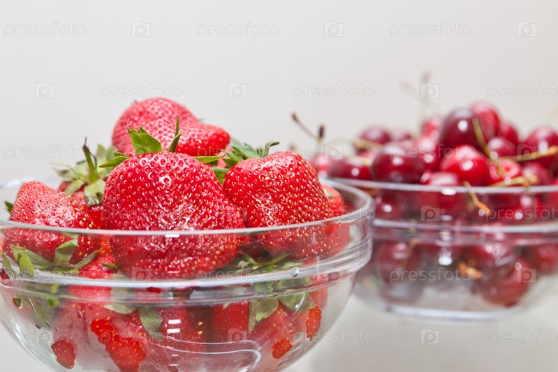 Две миски с клубникой и вишней