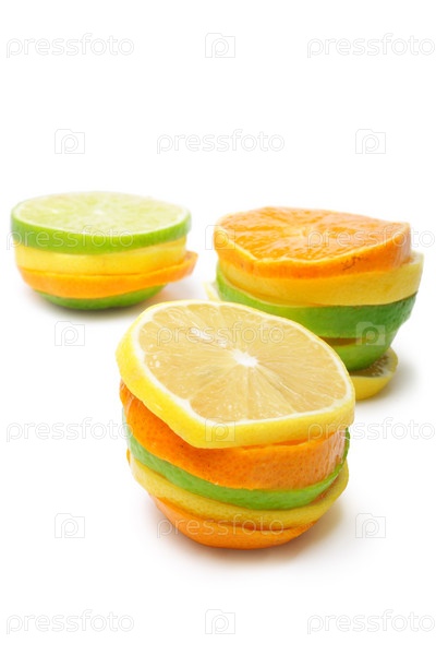 Свежие спелые фрукты (лимон, мандарин, лимон) на белом фоне (изолированные)