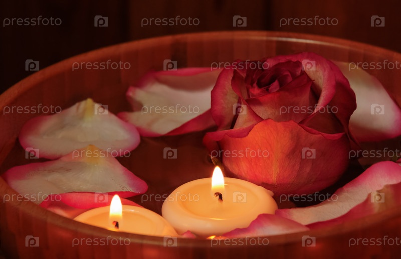 Лепестки роз, свечи и роза в миске с водой