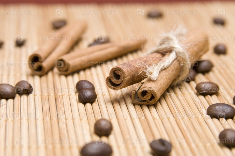 Палочки корицы и кофейные зерна на тростниковом коврике